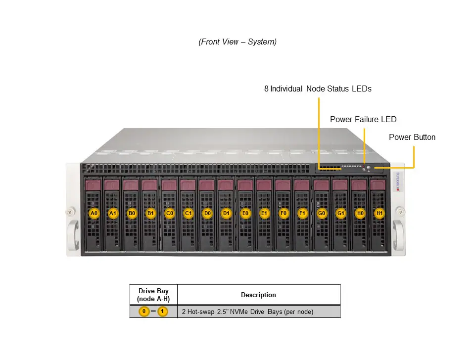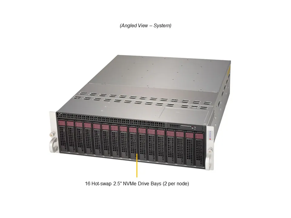| Drive Bays Storage per Node - Drive Bays Configuration | Default: Total 2 bays 2 front fixed 3.5"/2.5" NVMe/SAS*/SATA* drive bays (*SAS/SATA support may require additional storage controller and/or cables) View NVMe Options View Drive Options |