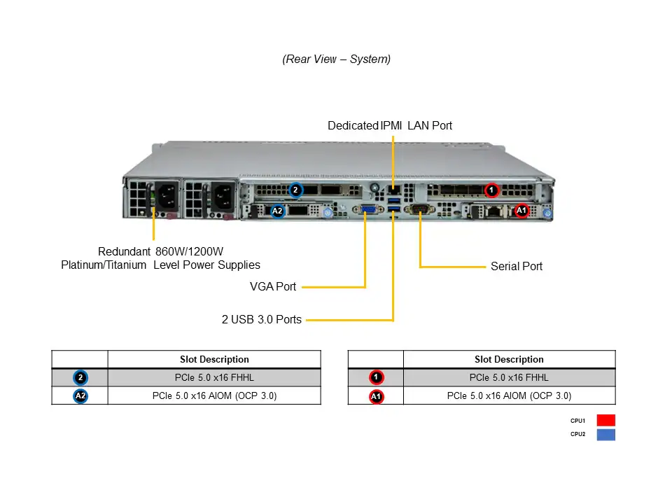 | Expansion Slots - PCI-Express PCIe Configuration | Default 2 PCIe 5.0 x16 FHHL slots 2 PCIe 5.0 x16 AIOM slots (OCP 3.0 compatible) View AOC Options |