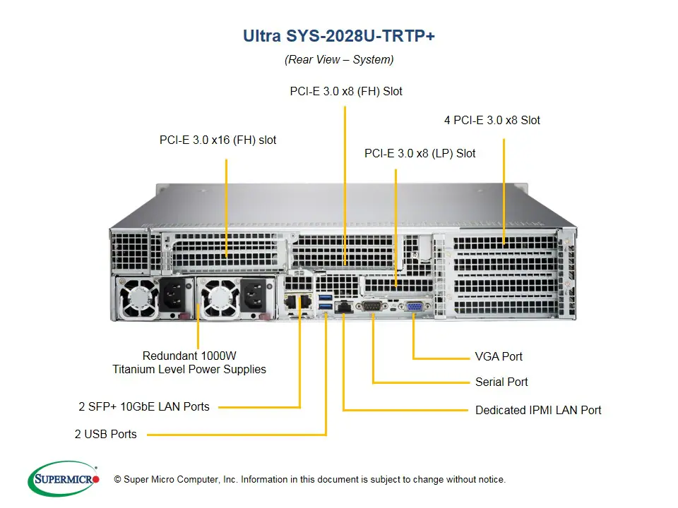 | Input Output - LAN | 2x 10G SFP+ ports 1x RJ45 Dedicated IPMI LAN port |