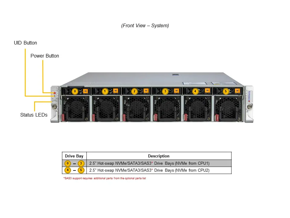 | Drive Bays Storage - Drive Bays Configuration | Default: Total 6 bays 6 front hot-swap 2.5" NVMe*/SAS*/SATA* drive bays (*NVMe/SAS/SATA support may require additional storage controller and/or cables) View NVMe Options View Drive Options |