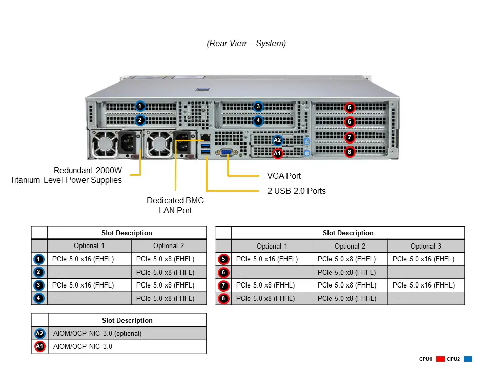 | Expansion Slots - PCI-Express PCIe Configuration | Option A* 3 PCIe 5.0 x16 (in x16) FH/10.5"L double-width slots 2 PCIe 5.0 x8 (in x16) FHHL slots 2 PCIe 5.0 x16 AIOM slots (OCP 3.0 compatible) Option B* 3 PCIe 5.0 x16 FH/10.5"L slots 1 PCIe 5.0 x16 FHHL slot 2 PCIe 5.0 x16 AIOM slots (OCP 3.0 compatible) Option C 6 PCIe 5.0 x8 (in x16) FH/10.5"L slots 2 PCIe 5.0 x8 (in x16) FHHL slots 2 PCIe 5.0 x16 AIOM slots (OCP 3.0 compatible) (*Requires additional parts, please see the optional parts list for details. For more details on PCIe slot configuration options, please refer to the system callout images above.) View AOC Options |