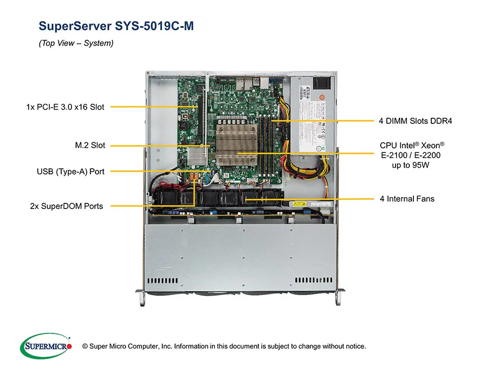 | Processor - CPU | Single Socket H4 (LGA 1151), CPU TDP support up to 95W Support Intel® Xeon® processor E-2100 / E-2200 series, 8th/9th Gen. Intel® Core™ i3 / Pentium® / Celeron® Processors |
